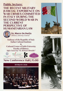 В рамките на инициативите за насърчаване на културата на паметта д-р Марко Де Паолис – Главния военно-апелативен прокурор към Военния апелативен съд в Рим – има удоволствието да изнесе публична лекция в Новата конерентна зала на Софийския университет „Св. Климент Охридски“. Смятан за един от най-изтъкнатите юристи в областта на военните престъпления, извършени от нацистко-фашисткия […]